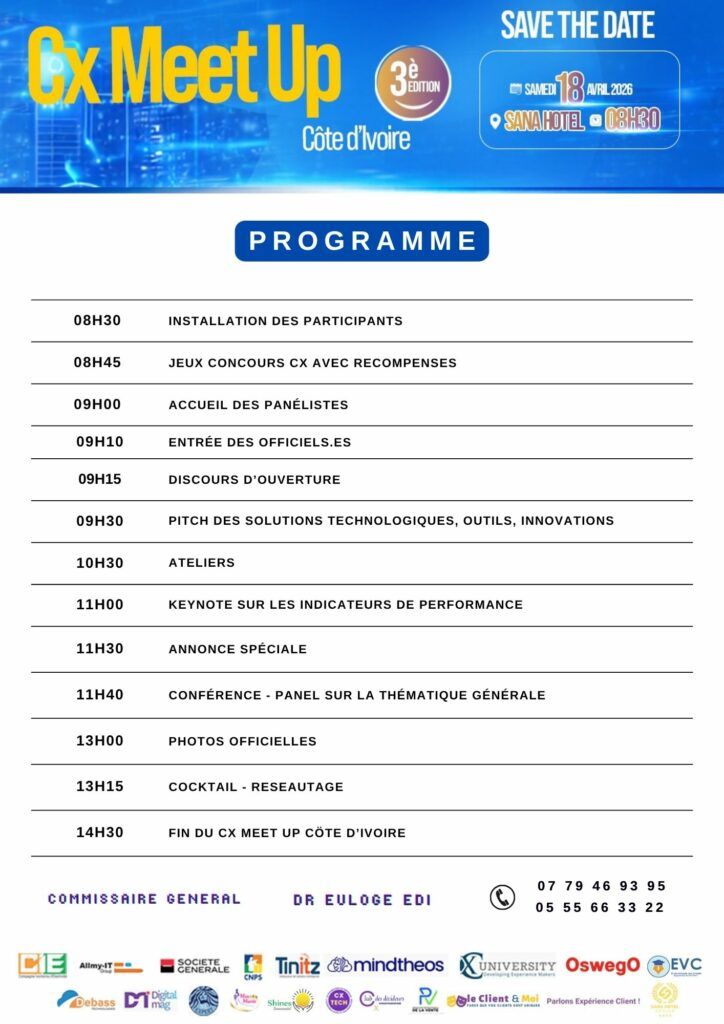 Le CX Meet Up Côte d’Ivoire, édition 03 est un rendez-vous professionnel panafricain, dédié à celles et ceux qui veulent faire du service client un véritable levier de performance et de différenciation. Centrée sur la thématique « Les solutions innovantes pour un service client performant », cette édition mettra en lumière les méthodes, indicateurs, outils et retours d’expérience qui permettent de passer d’un service client réactif à un service client proactif, piloté par les données et soutenu par la technologie.