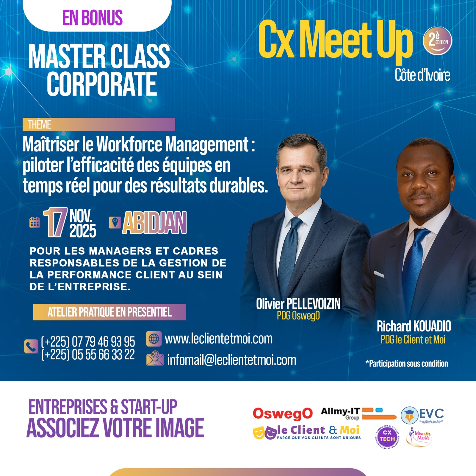 Cadres et managers de la performance client, cette MASTER CLASS CORPORATE en présentiel est conçue pour vous. Ne manquez pas cette opportunité unique d’approfondir vos connaissances et d’adopter des pratiques innovantes.